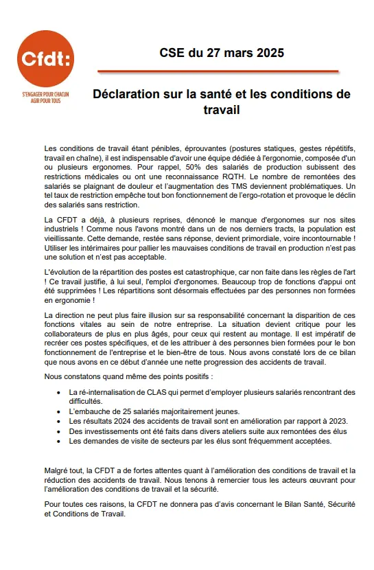 Déclaration CSE sur la santé et les conditions de travail